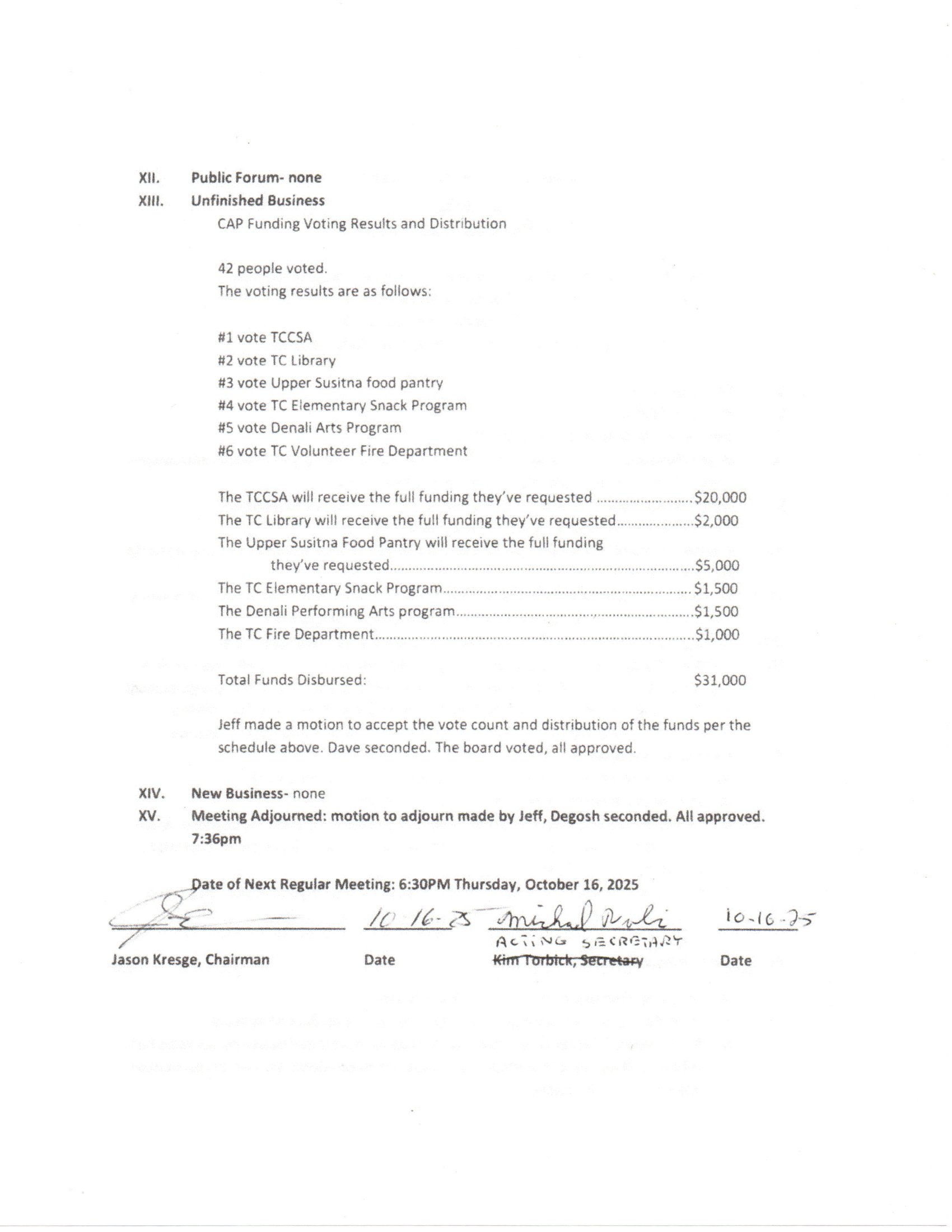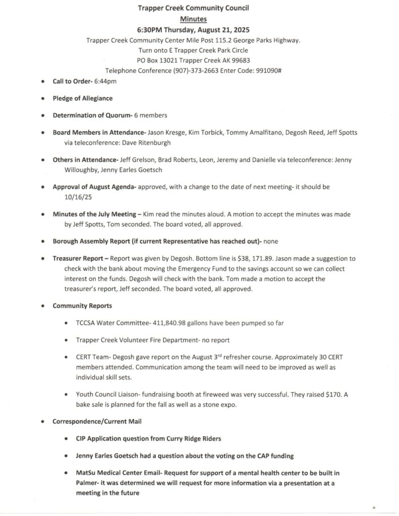 The decision for FY24/25 Community Assistance Program (CAP) funds disbursement will be discussed and decided at the August 21, 2025 meeting. The Trapper Creek Community Council has already secured these funds which means that once the decisions are confirmed, the eligible applicants will receive their awarded funds in a timely manner. For questions or concerns, please contact the Council at: trappercreek2010@gmail.com