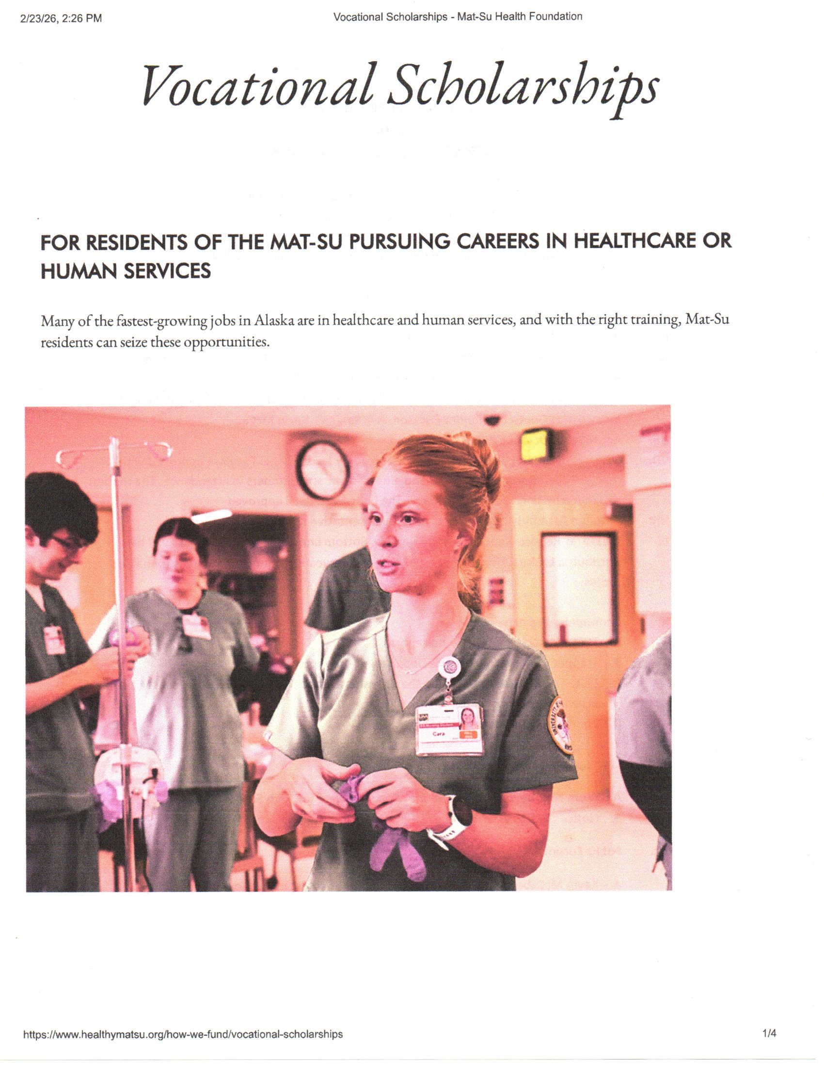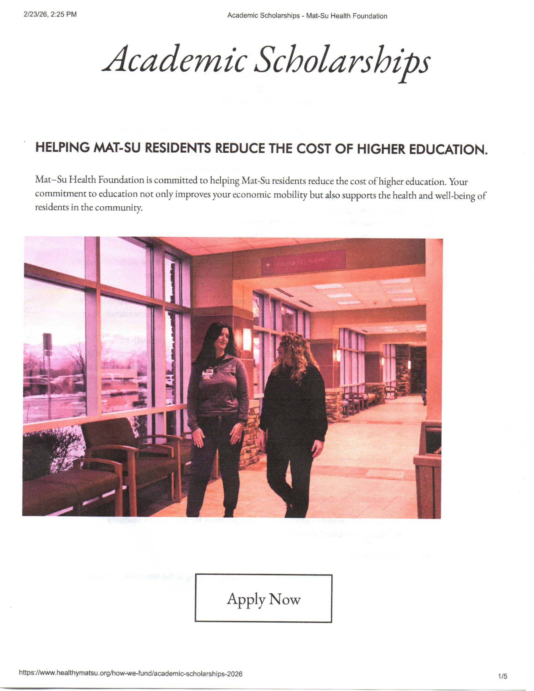 Council was made aware of these two Scholarships at our last meeting February 19, 2026. Hosted by Mat-Su Health Foundation. Academic and Vocational. Deadline is approaching please contact Rachel Christensen at (218) 969- 9528 or go to healthymatsu.org