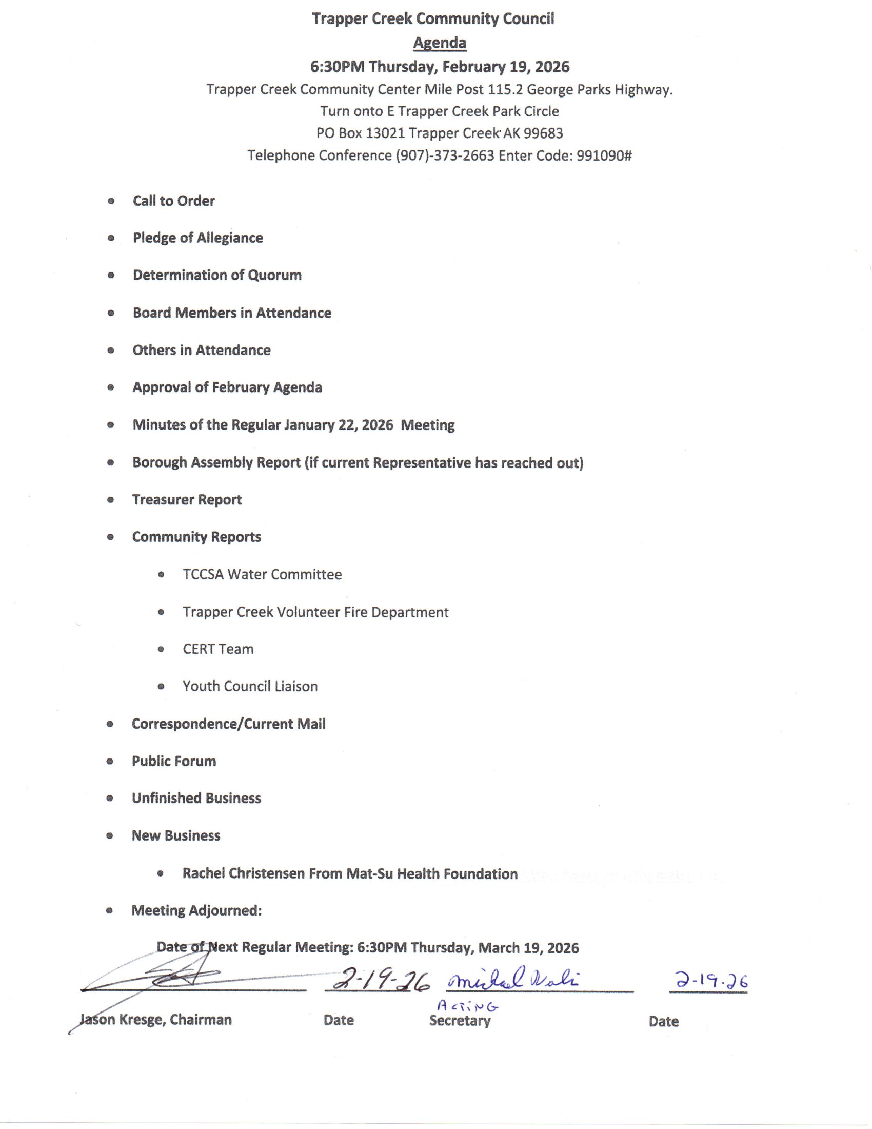 Trapper Creek Community Center Mile Post 115.2 George Parks Highway.