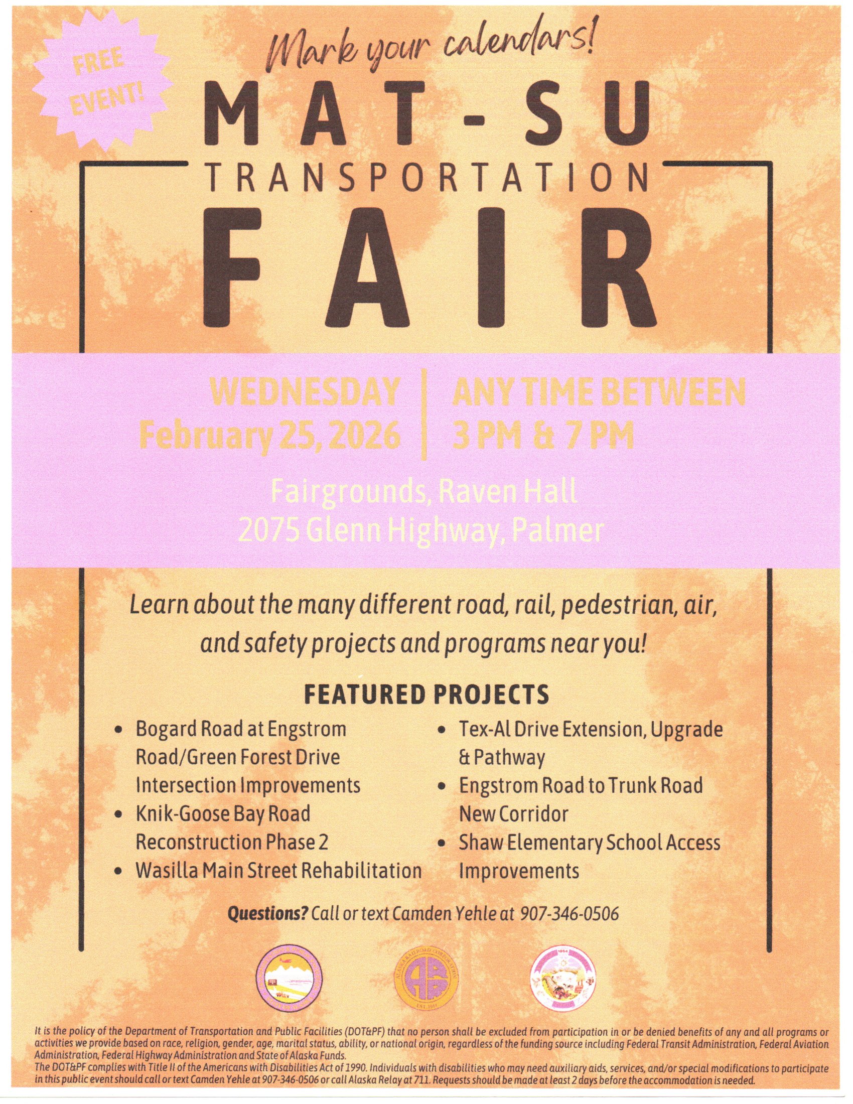 Mat-Su Transportation Fair Wednesday February 25, 2026 At The Fairgrounds.For more information call Camden Yehle @ 907 346 0506