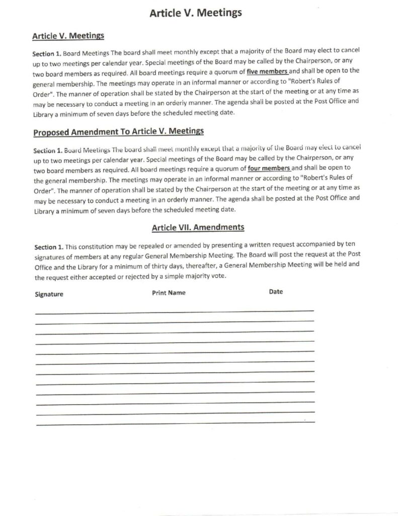​Council has proposed an Amendment to its by-laws we propose to change the number needed for a Quorum from 5 to 4. This Amendment will facilitate Councils ability to conduct meetings. Copies are posted at the Library and Councils bulletin board at the Post Office where you can sign the proposal. Attached is a copy.